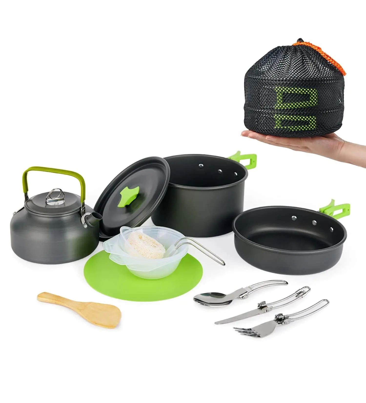 Camping cookware and kettle is made of ultra-light hard anodized aluminum and food grade silicone material that meets European and American food safety standards, which is healthy and safety, high temperature resistant, scratch resistance, oxidation resistance.