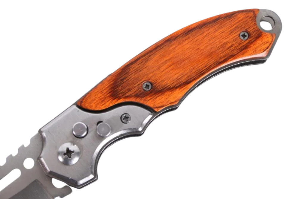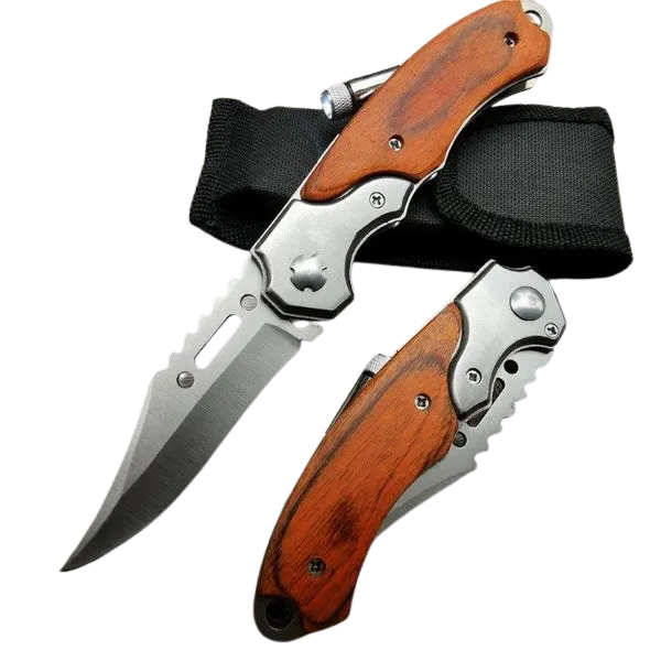 Featured in this lot is a stainless steel clip point switchblade knife and flashlight. The knife features a stainless steel clip point, single-edged blade with a flashlight along the back of the grip. The knife shows steel bolster scales with wooden grip scales with a red wood finish. The back of the grips show a compact flashlight with a twist activation. The knife shows good condition with little to no wear. The knife measures 7 3/4″ long with the blade being 3 1/4″ long. The knife measures 4 1/2″ long closed.